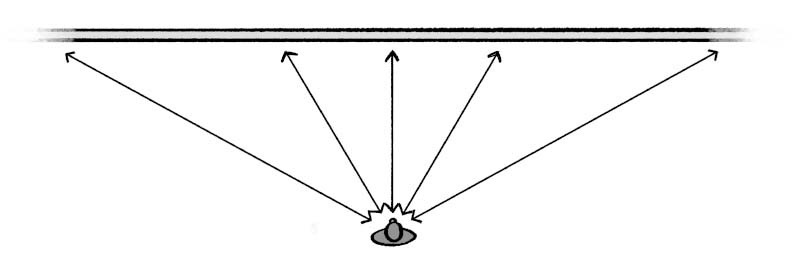 But how about we take a few steps back from the wall and look at it directly. In linear perspective this would be drawn as two horizontal lines representing the top and bottom of the wall. It's the same size across the whole frame. No diminishment. Seems fine. But if we look down on the situation from above we will see that our distance from the wall is not consistent across its length. We are very close to the wall right in front of us but as we look left and right we find that our distance from the wall gets greater and greater. The first rule of perspective says that objects that are further from us should appear smaller and yet this wall isn't diminishing at all. What's going on? Shouldn’t linear perspective be able to follow the number one rule?
